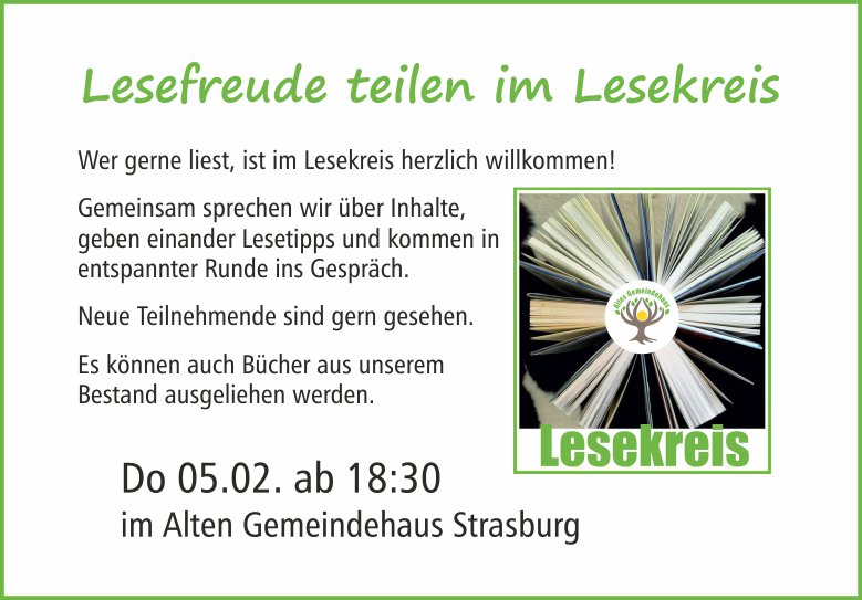 Außerdem können im Alten Gemeindehause jeden Donnerstag von 16 bis 18 Uhr Bücher ausgeliehen werden.