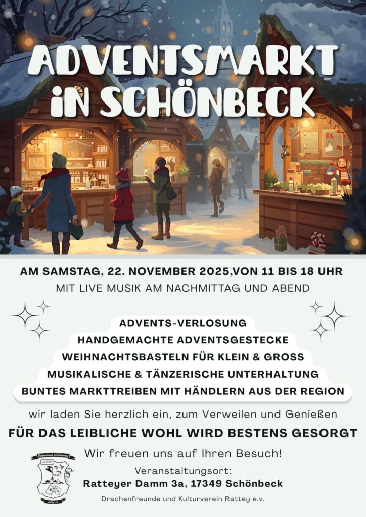Der Drachenfreunde und Kulturverein Rattey e.V. lädt am 22. November herzlich zum stimmungsvollen Adventsmarkt ein! Zahlreiche Händler erwarten Euch mit einer großen Auswahl an Adventsgestecken, an winterlicher und weihnachtlicher Dekoration aus Holz, Naturmaterialien, Gips, Keramik u.v.m. Freut Euch außerdem auf leckeres Gebäck, Marmeladen, Honig, Strickwaren, Geschenkartikel und vieles mehr.